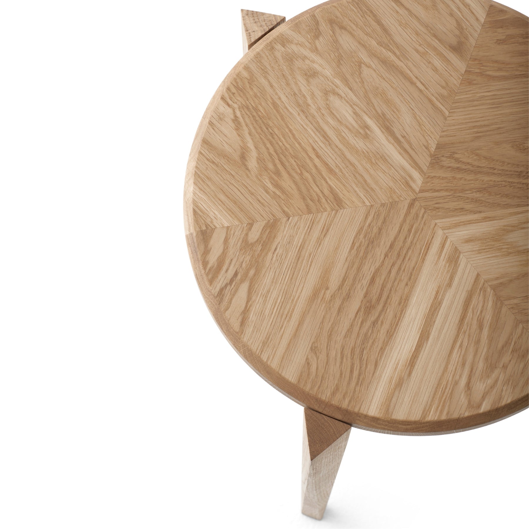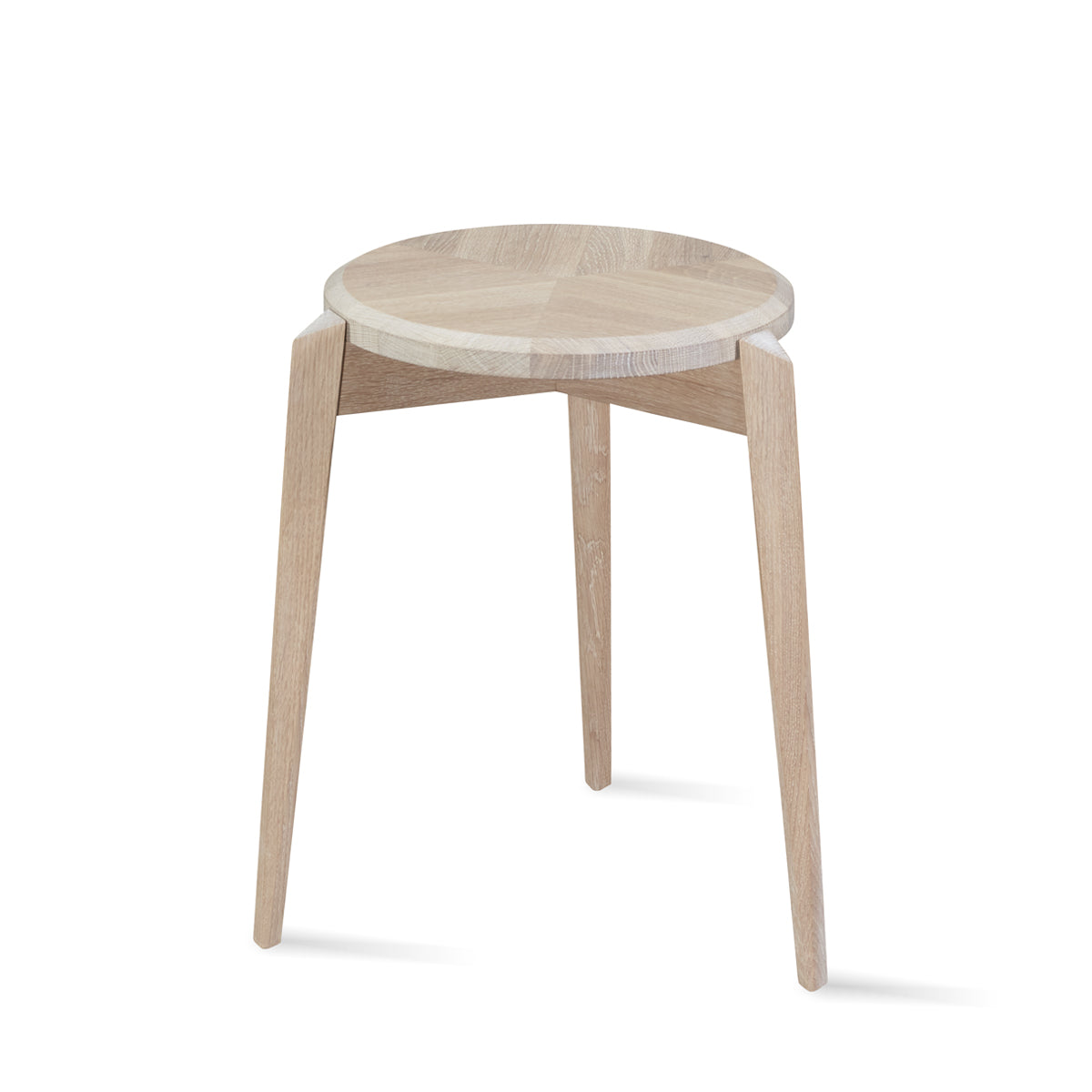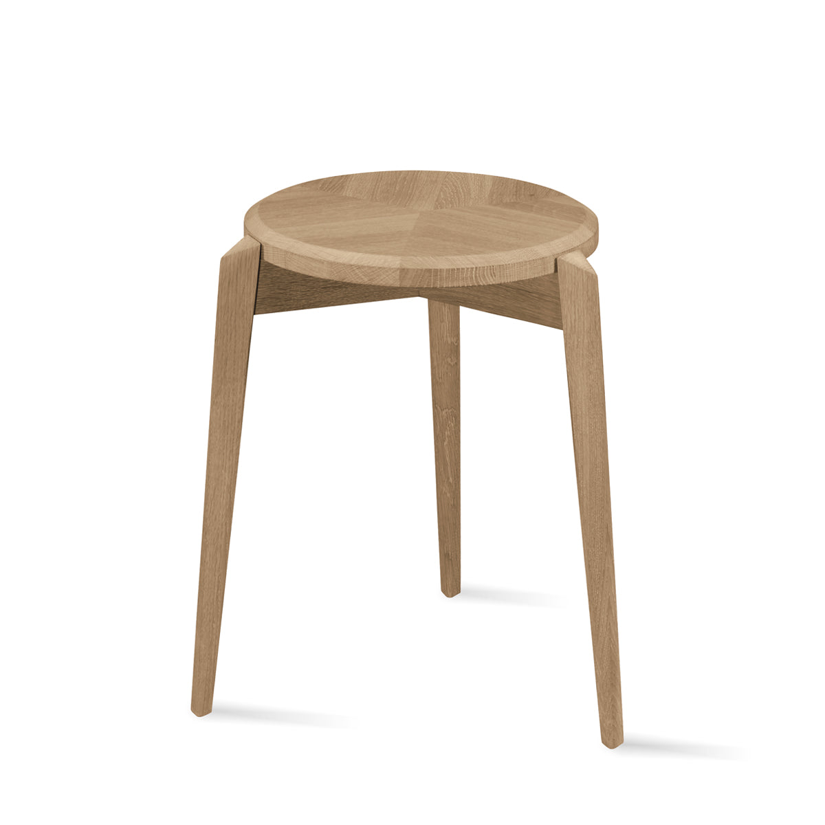 Tre præcist sammensatte dele danner sædets karakteristiske mønster, der sammen med de skarpt afskårne ben giver taburetten et skulpturelt og moderne udtryk.