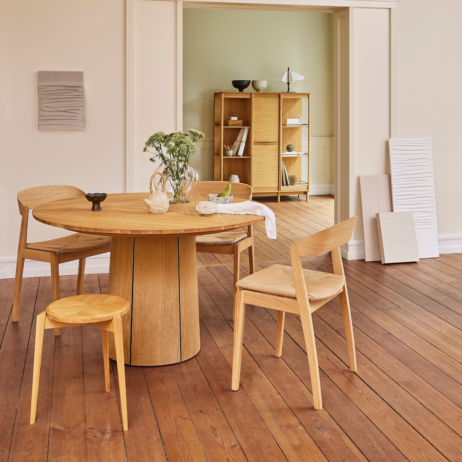 Taburetten kan bruges som ekstra siddeplads, lille sidebord eller som et dekorativt element i indretningen – et multifunktionelt møbel, der forener håndværk, bæredygtighed og smukt dansk design.