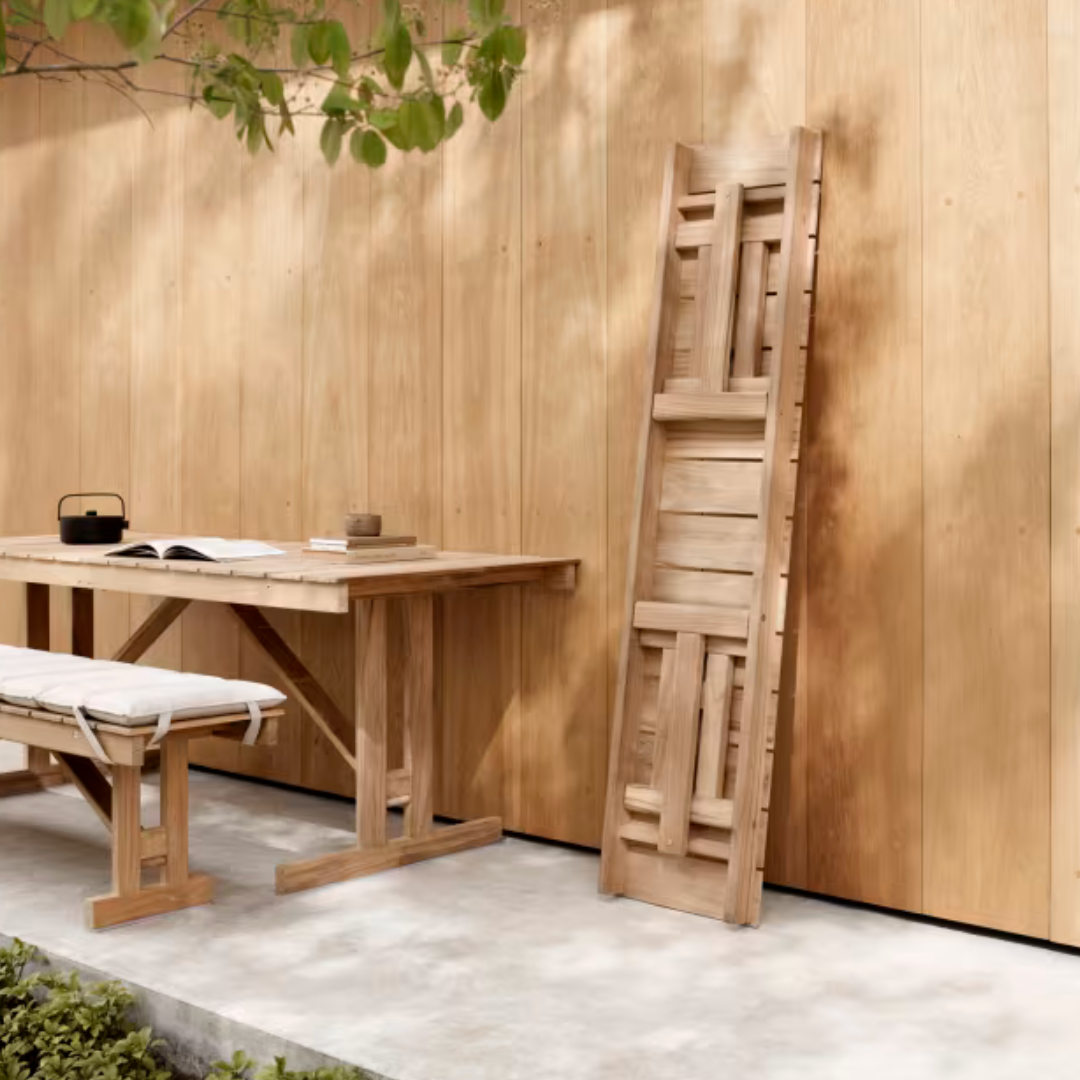 Carl Hansen & Søn genintroducerer det klassiske design, der er kyndigt udformet i ubehandlet og holdbart FSC®-certificeret teaktræ. Bænken fra serien har robuste ben, der praktisk kan foldes ind under det elegante sæde i trælameller og kan nemt opbevares, når den ikke er i brug.