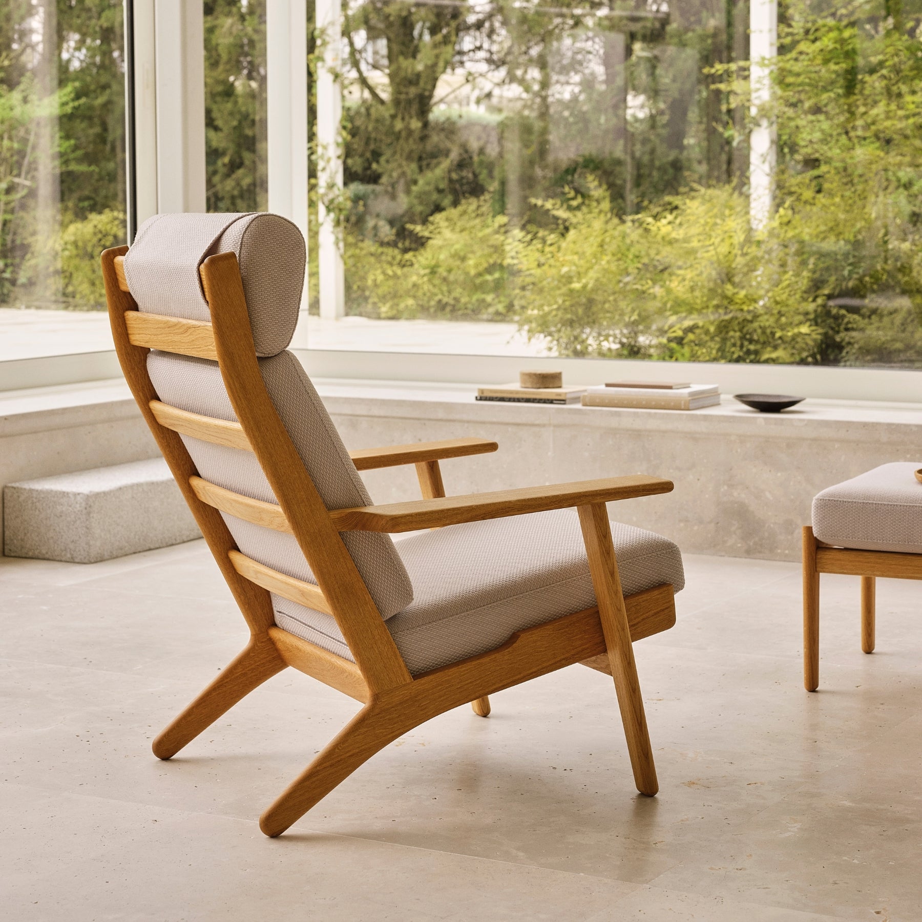 Stolen er udført i FSC™-certificeret eg, hvor hver linje og samling er nøje afstemt for at fremhæve det ærlige håndværk. Den høje ryglæn og den blødt polstrede nakkepude giver optimal støtte, mens de dynamisk vinklede ben og brede armlæn tilfører et karakteristisk udtryk. Polstringen er udført med sans for både komfort og proportion, hvilket skaber en lounge-stol, der indbyder til ro og fordybelse.