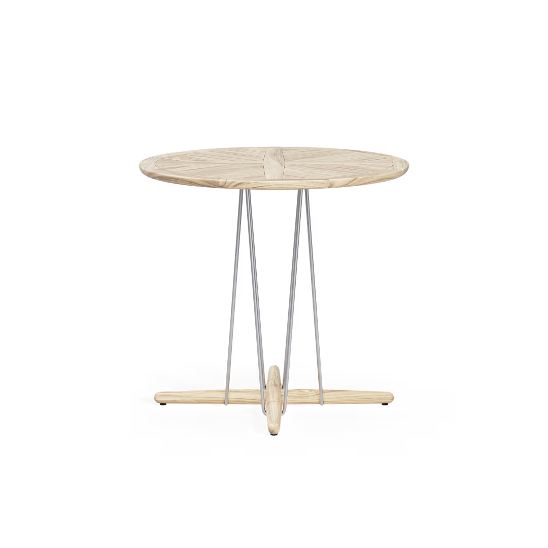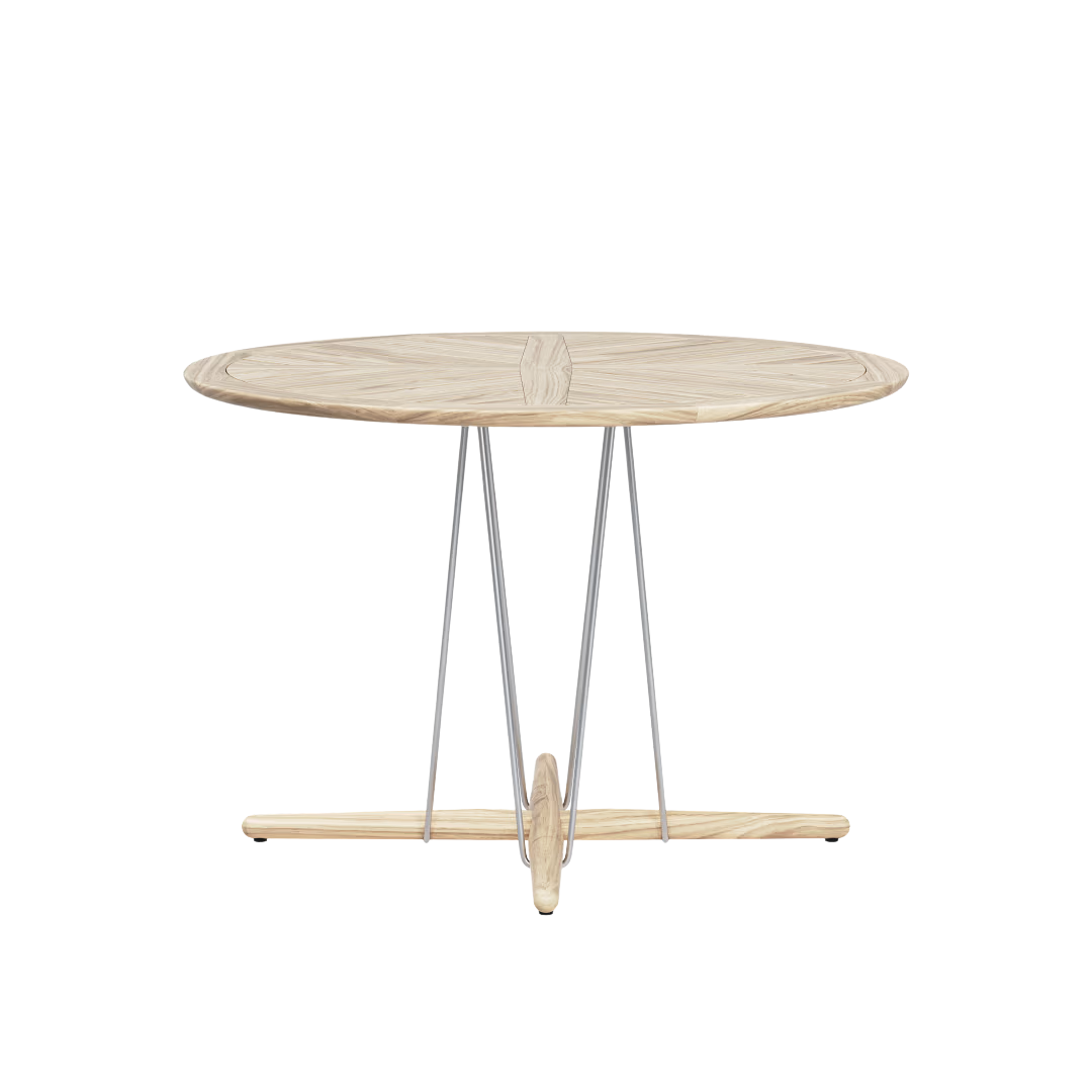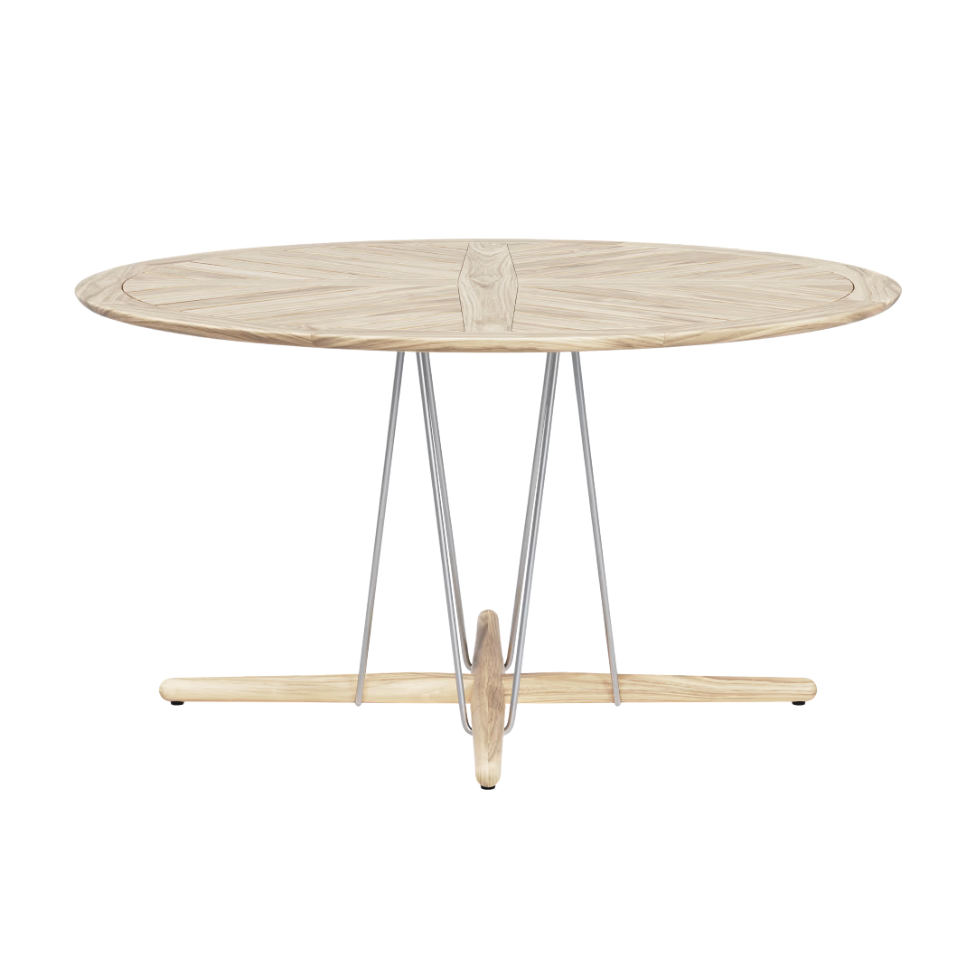 Det runde bord i ubehandlet teak har samme silhuet som indendørsmøblerne i Embrace-serien. Kontrasten mellem det robuste stålwirestel, foden og bordpladen i massivt træ giver bordet et dynamisk udtryk og bringer komforten fra hjemmets inderum ud i haven.