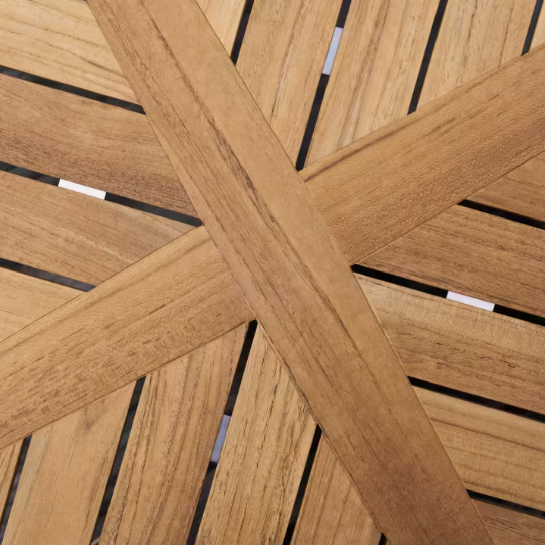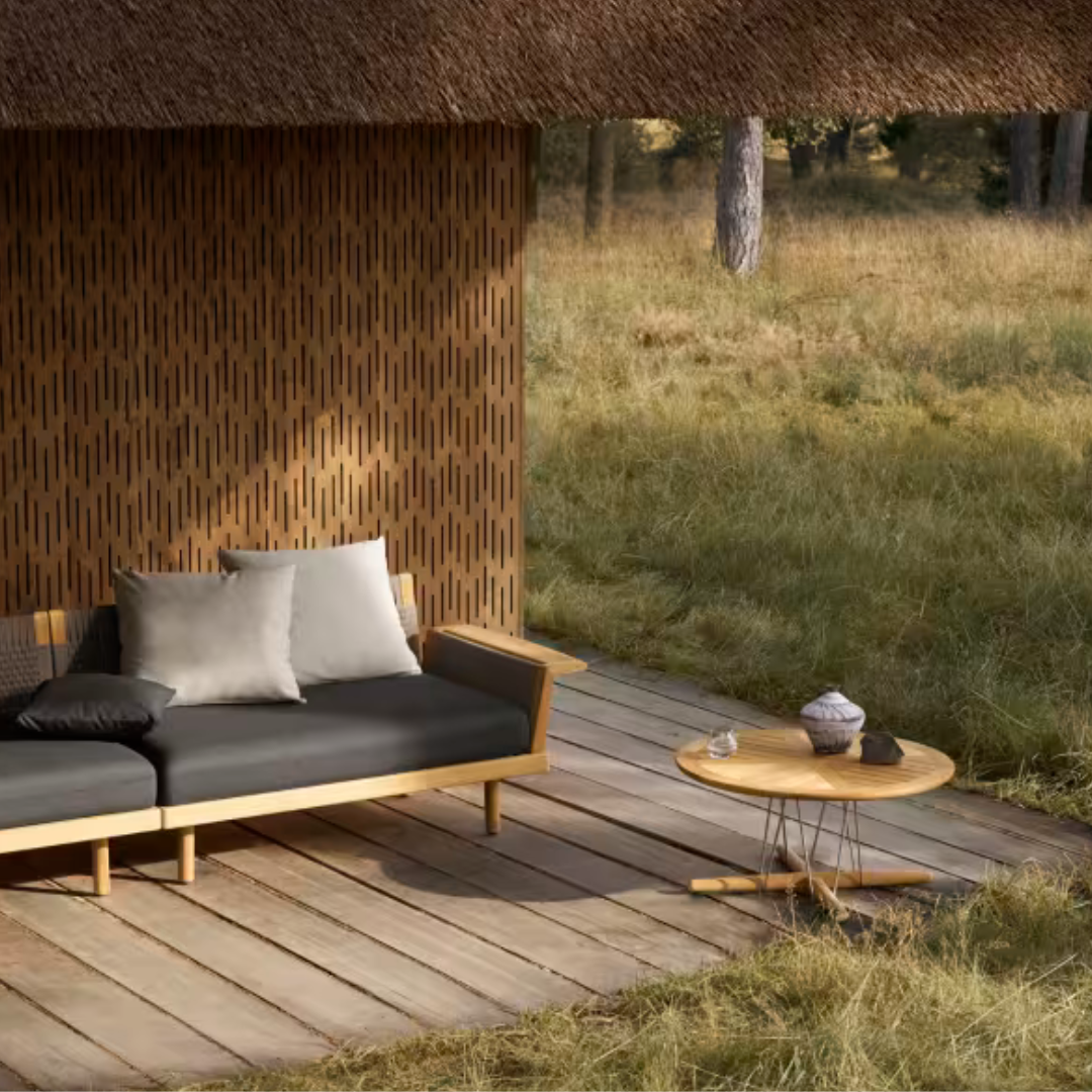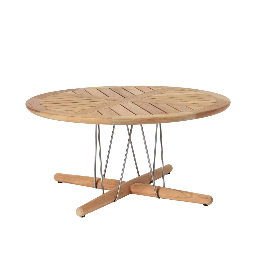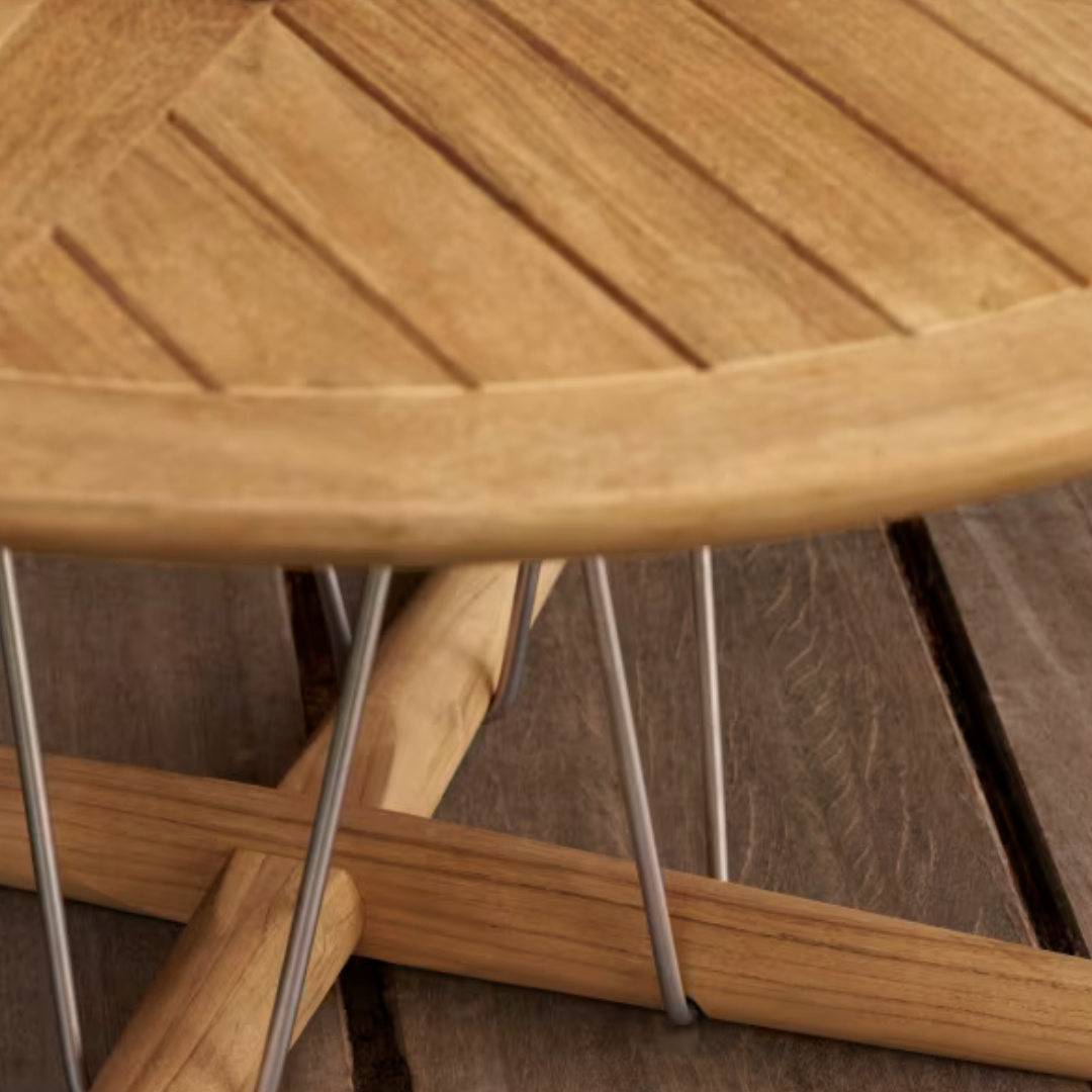 Embrace Outdoor Loungebord har en bordplade i massivt ubehandlet FSC®-certificeret teak i et dekorativt margueritlignende mønster.