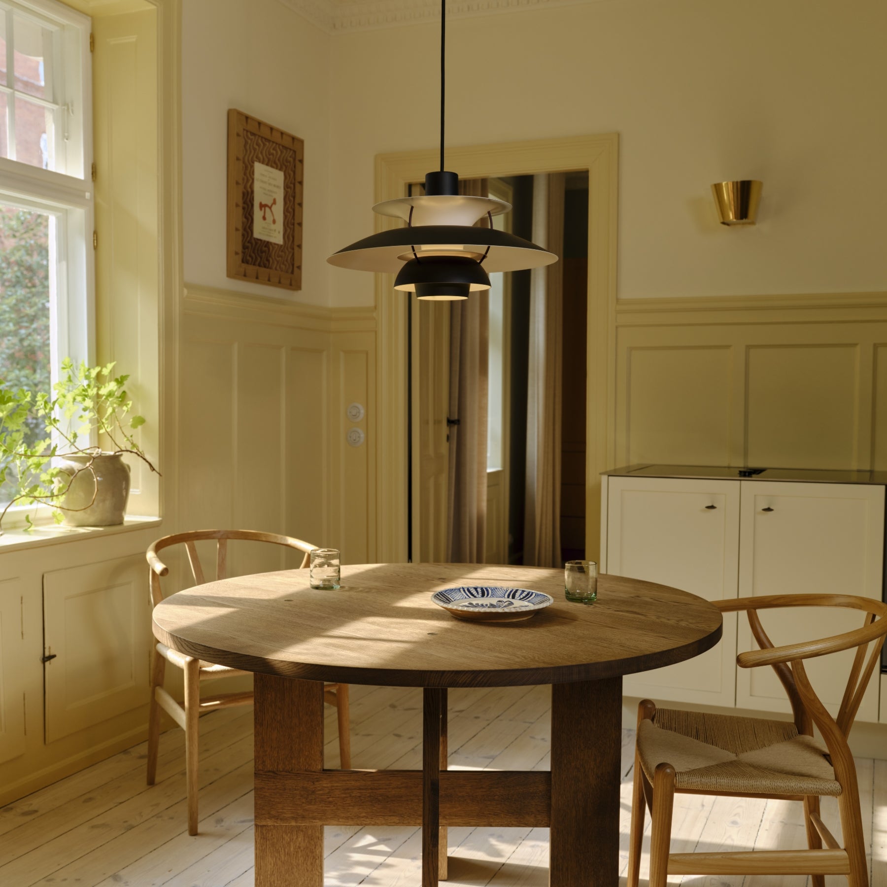 Den ikoniske PH 5 pendel fra Louis Poulsen er et mesterværk designet af Poul Henningsen i 1958 – skabt ud fra ønsket om at give et blændfrit og behageligt lys, uanset hvilken lyskilde der anvendes. Designet bygger på Henningsens berømte tre-skærmssystem, som fordeler lyset jævnt og skaber en varm og indbydende atmosfære over spisebordet.