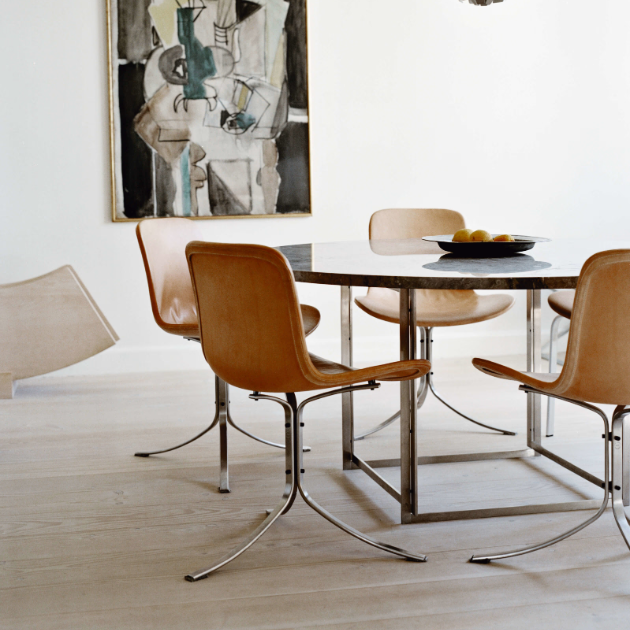 Den unikke form på PK9™ er karakteriseret ved tre stykker satinbørstet rustfrit fjederstål, der fungerer som en søjle for stolens lædersæde. Poul Kjærholm lod sig inspirere til stolens form af et aftryk hans hustru, Hanne Kjærholm, efterlod efter at have siddet i sandet på en af deres fælles strandture. Senere, i løbet af skabelsesprocessen, lod Poul Kjærholm sin kone sidde i kasser med ler, for at finde frem til den mest optimale og komfortable udformning af stolen.