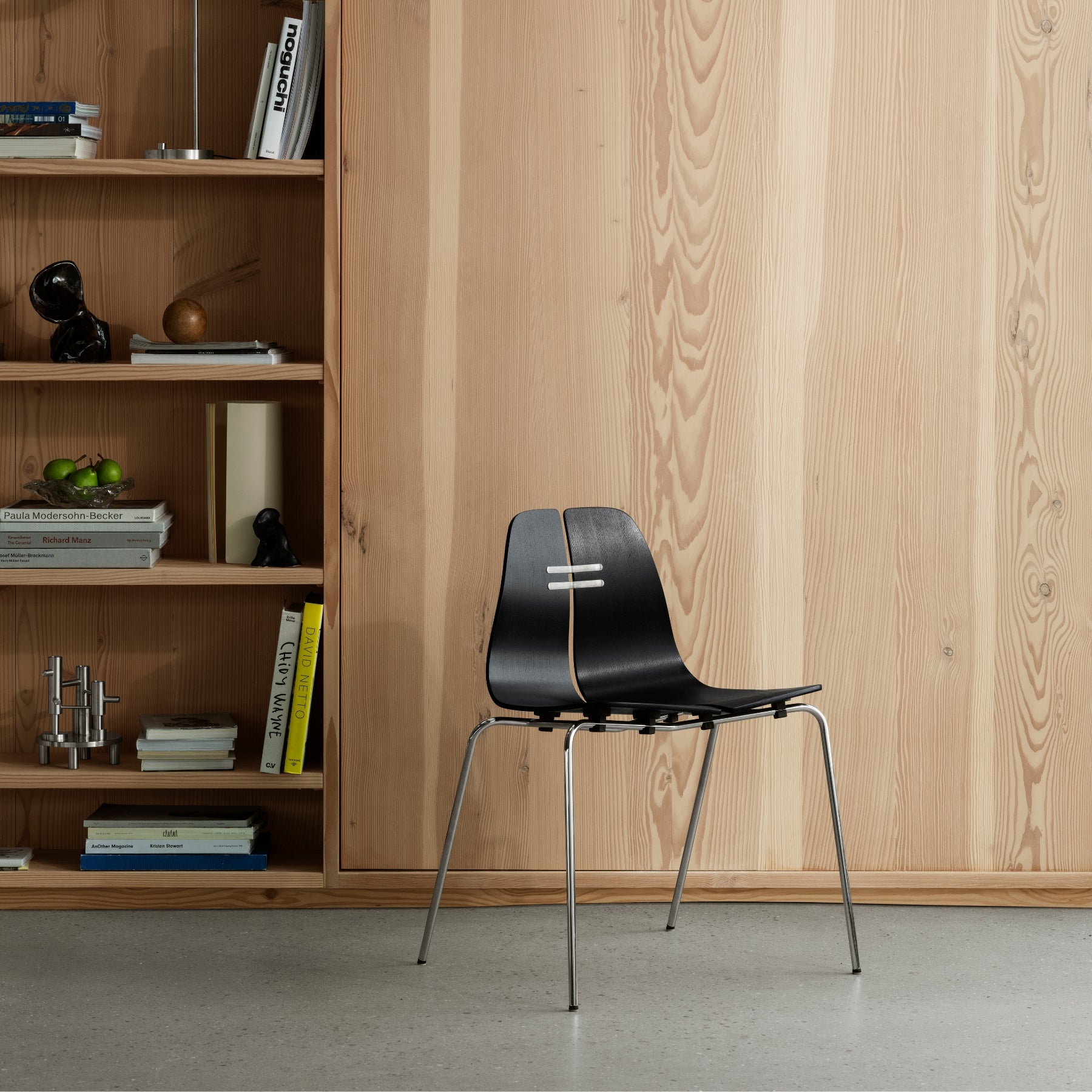 Stolen består af to spejlvendte skaller i formpresset finer, der mødes i en smuk og præcis samling med diskrete aluminiumsbeslag. Det todelte sæde hviler på en slank, men robust ramme i stålrør, hvilket giver PK3™ et svævende udtryk og en overraskende behagelig siddekomfort.