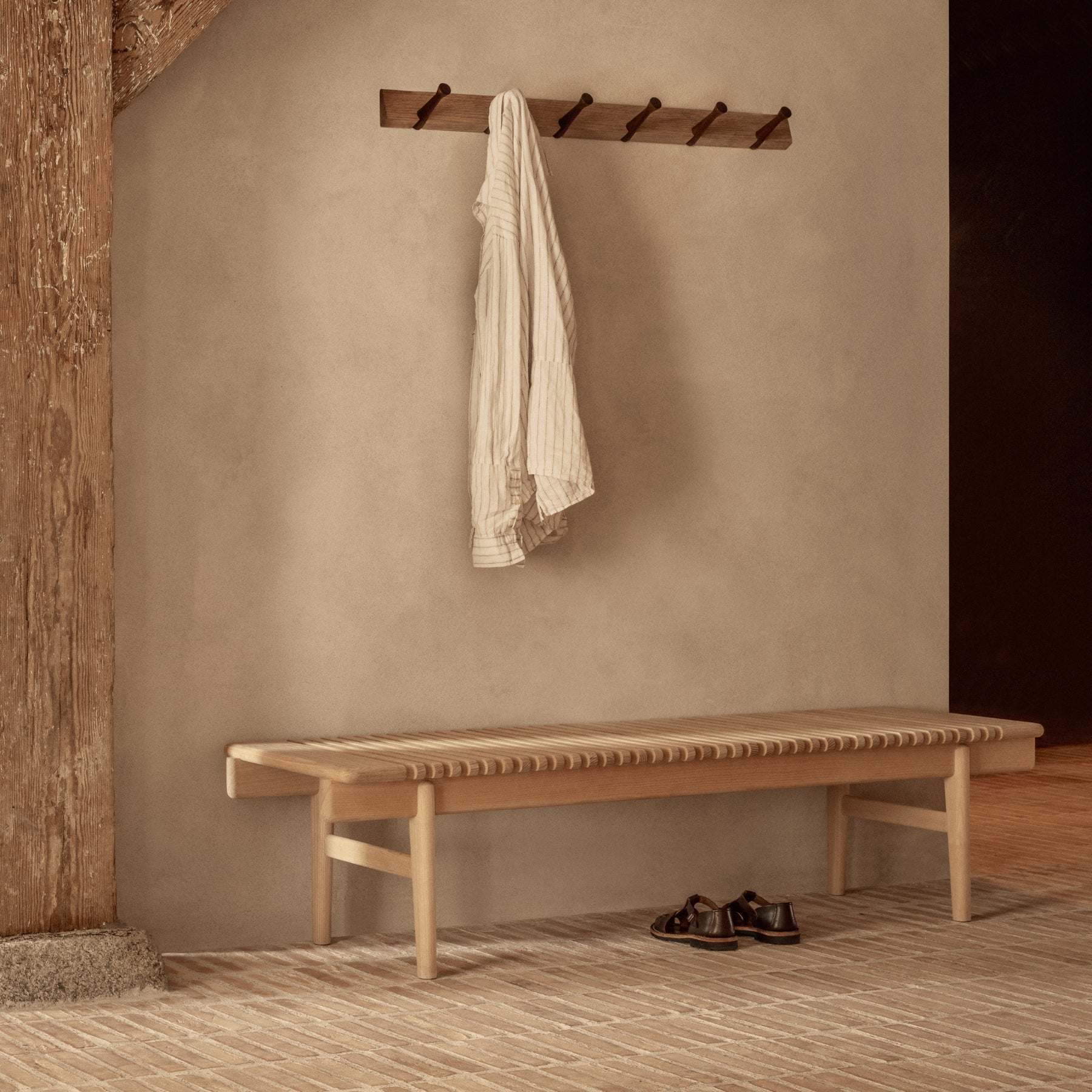 Wegner designede tremmebænken i 1953 til sin egen private entré. Bænken er praktisk, mens den fremstår som et smukt element, der smelter sammen med omgivelserne med dens lette struktur. Kendt og elsket verden over.