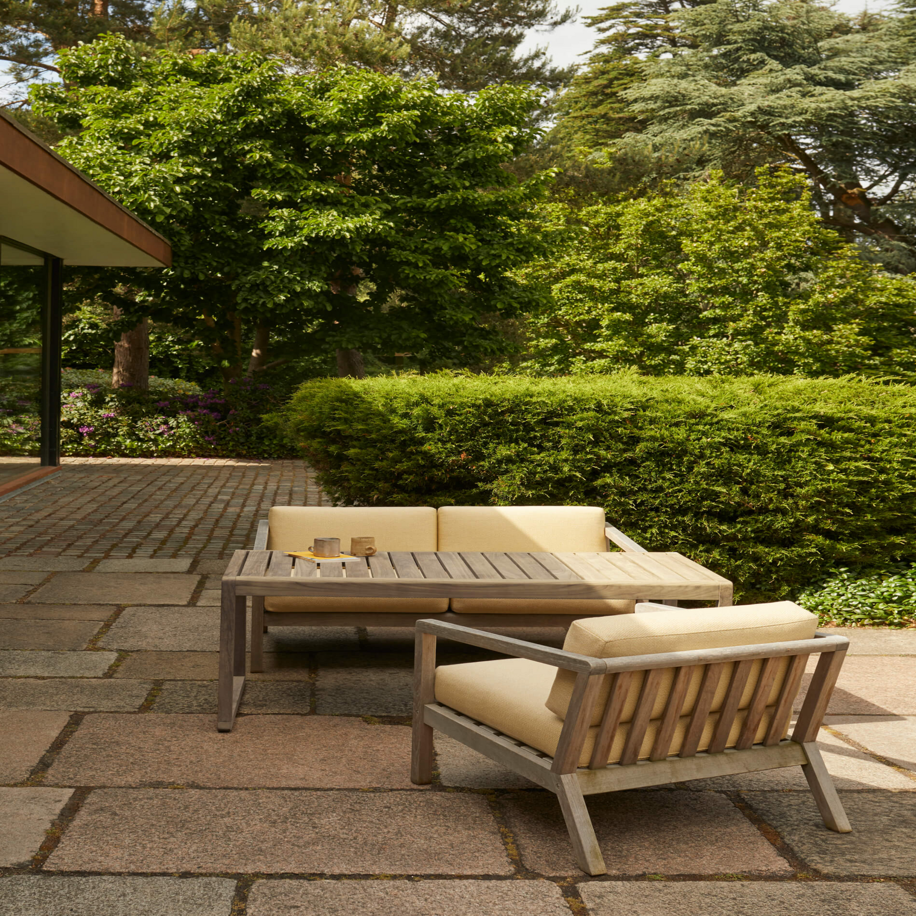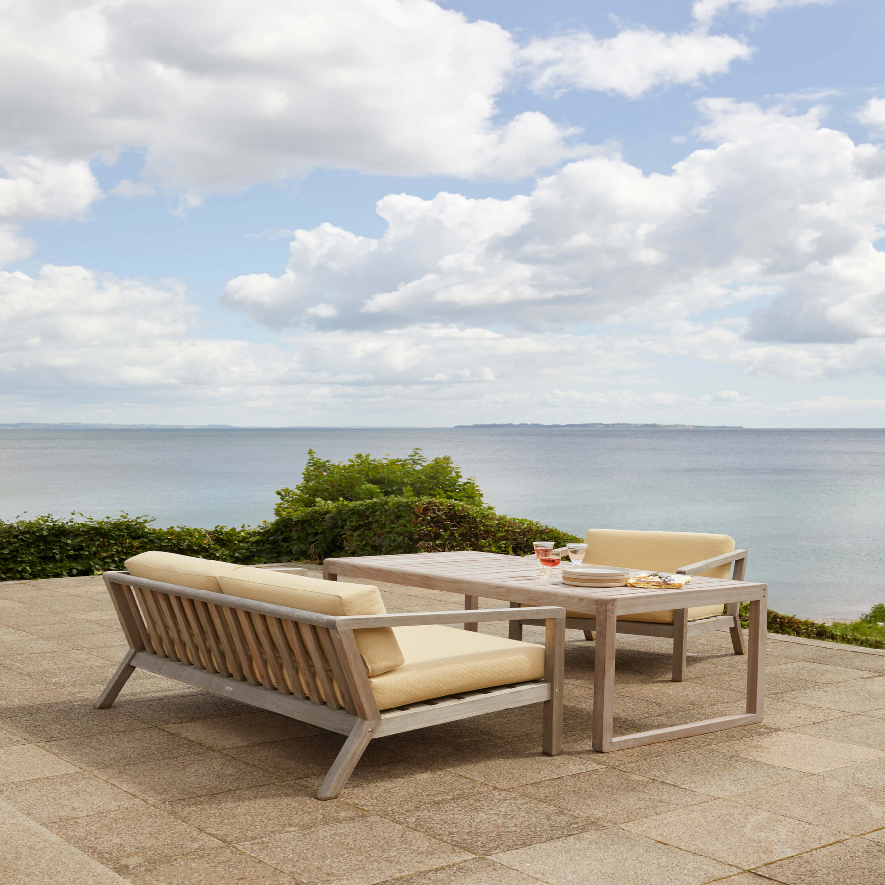 De rene linjer i stellet af FSC-certificeret teak står i elegant kontrast til de bløde og behagelige hynder. Perfekt til socialt samvær og luksuriøs afslapning på terrassen eller i haven. Det vejrbestandige betræk er Oeko-Tex®-certificeret, ekstremt farve- og lysægte samt vand- og smudsafvisende. Hynden tørrer hurtigt selv efter et kraftigt regnskyl, da skummet har en åben cellestruktur, som vand og luft kan passere igennem.