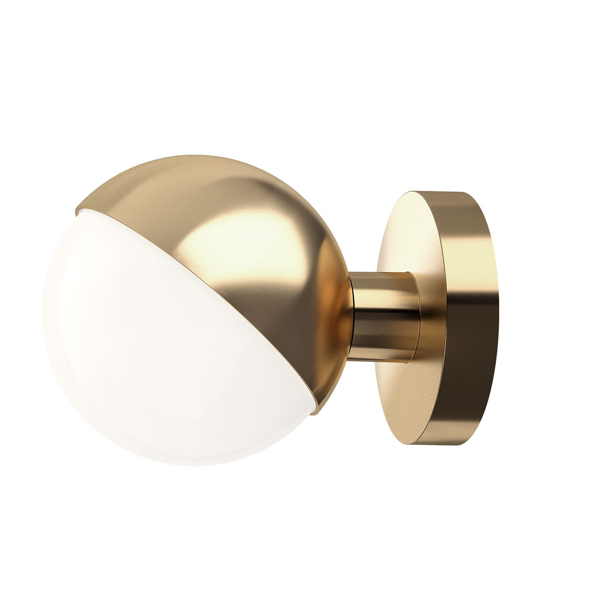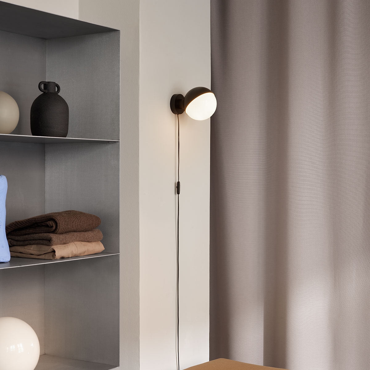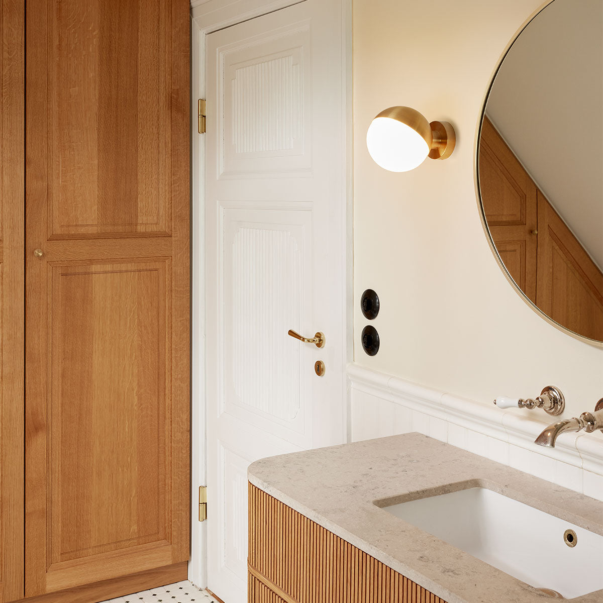 Materialer: Børstet messing med fine hårlinjer. Blankt, hvidt, opalt glas. Materialer: Armaturhus og bagdåse: Børstet messing. Glas: Mundblæst, opalt trelagsglas, blankt. Bemærk, at messingoverfladen er ubehandlet. Det betyder, at overfladen vil ændre sig over tid og patinere. Ledningslængde: 2,5 m. Ledning: Hvid plast med stik.